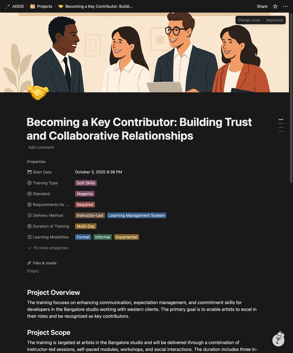 To support the creation of effective training aims and objectives, the workflow integrates an AI Chat Assistant accessible directly within Notion. The assistant is trained on the proprietary Weighted Objective Accountability Framework, which combines Mager’s ABCD model with a weighted scoring methodology that links objectives to measurable accountability activities. By referencing the Project, Analysis, and Design document IDs, the assistant can contextualize its recommendations and guide users through drafting and refining precise training aims and objectives. This ensures that the instructional intent is both measurable and strategically grounded.