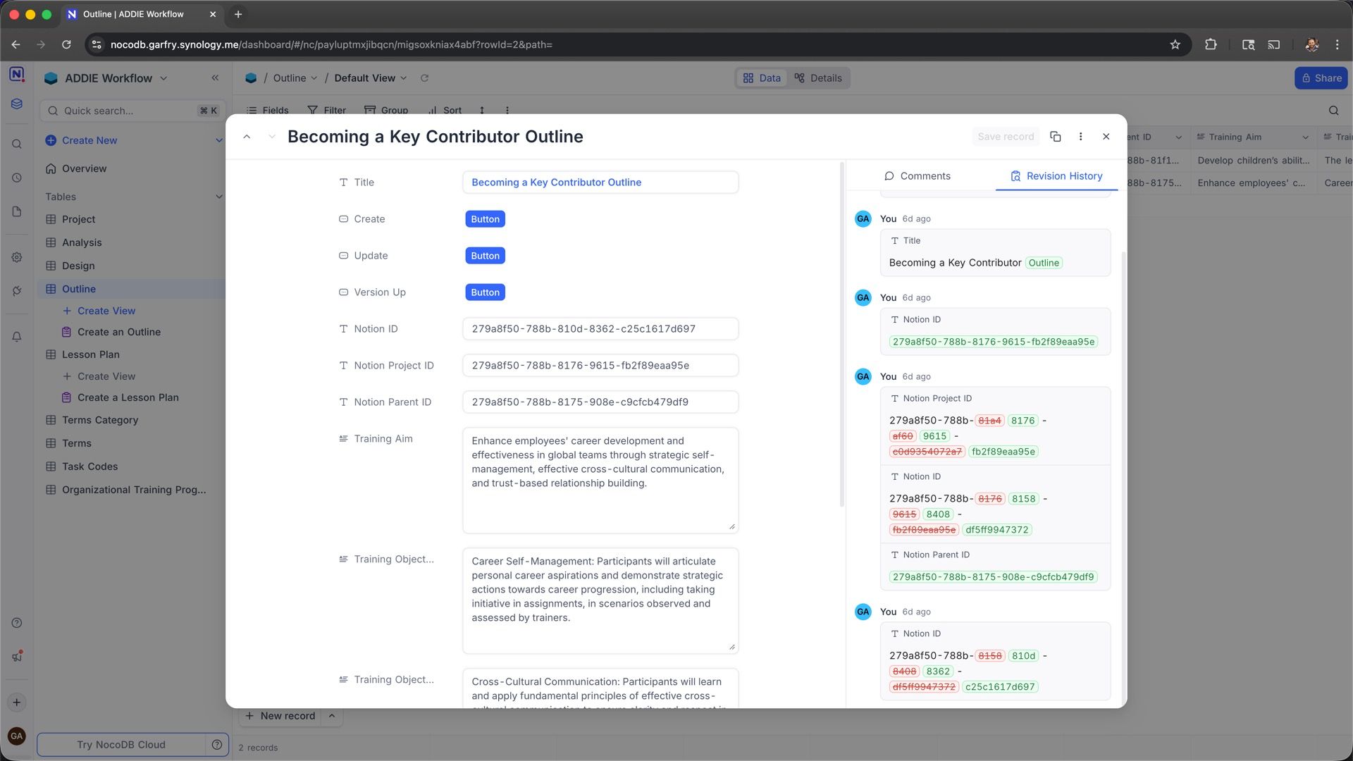 Once the document is generated, human-in-the-loop review ensures that all instructional design elements are contextually appropriate and aligned with organizational needs. Users can revise or regenerate the document directly through NocoDB—either updating the current version or creating a new iteration—while maintaining full version history and traceability. After validation, an automated email draft is created in Notion for seamless stakeholder distribution and approval.