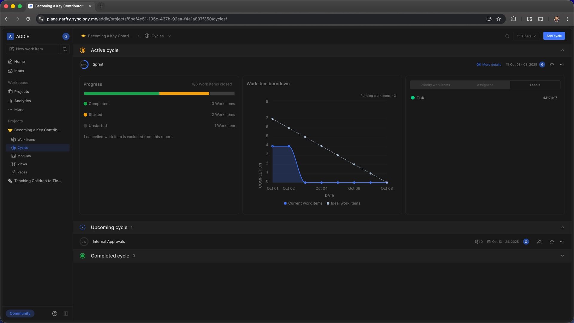 Each cycle within Plane features its own analytics dashboard, providing immediate insight into progress metrics, burn-down rates, workload distribution, and completion percentages. Custom views and filters further empower teams to monitor specific subsets of work—such as activities by modality, assignee, or priority—enhancing both visibility and accountability across the L&D production process.
