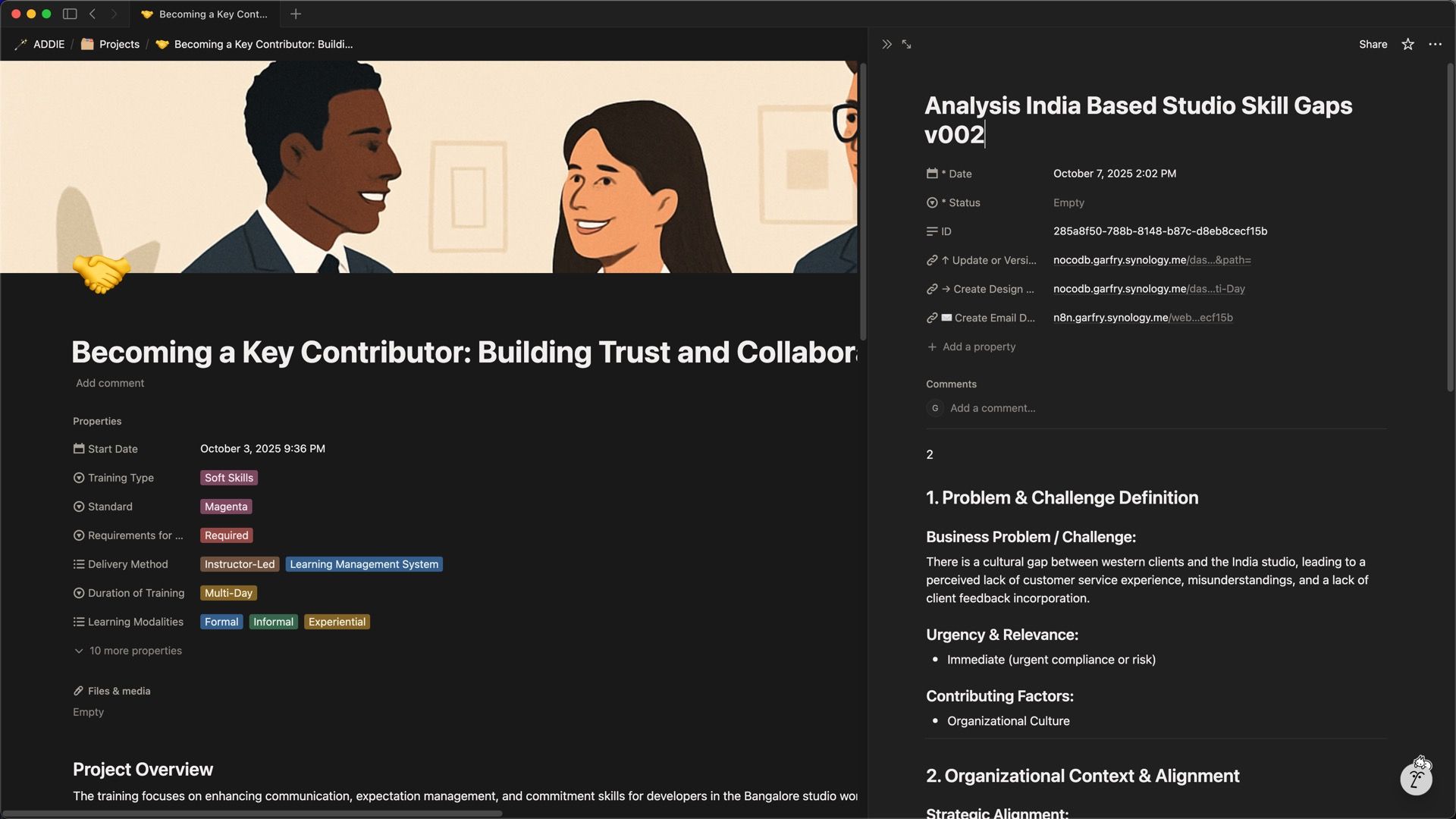 Using the Analysis Form in NocoDB, Learning and Development (L&D) professionals capture essential diagnostic data—such as problem definitions, urgency, contributing factors, strategic alignment, and audience characteristics. The form also includes predefined drop-down fields linked to a central terminology database in NocoDB, ensuring that both humans and AI reference consistent language across projects. For additional AI context, users may supplement the input with a Content and Definitions Document in Notion, enabling the system to interpret proprietary terms or internal systems without cluttering official documentation.