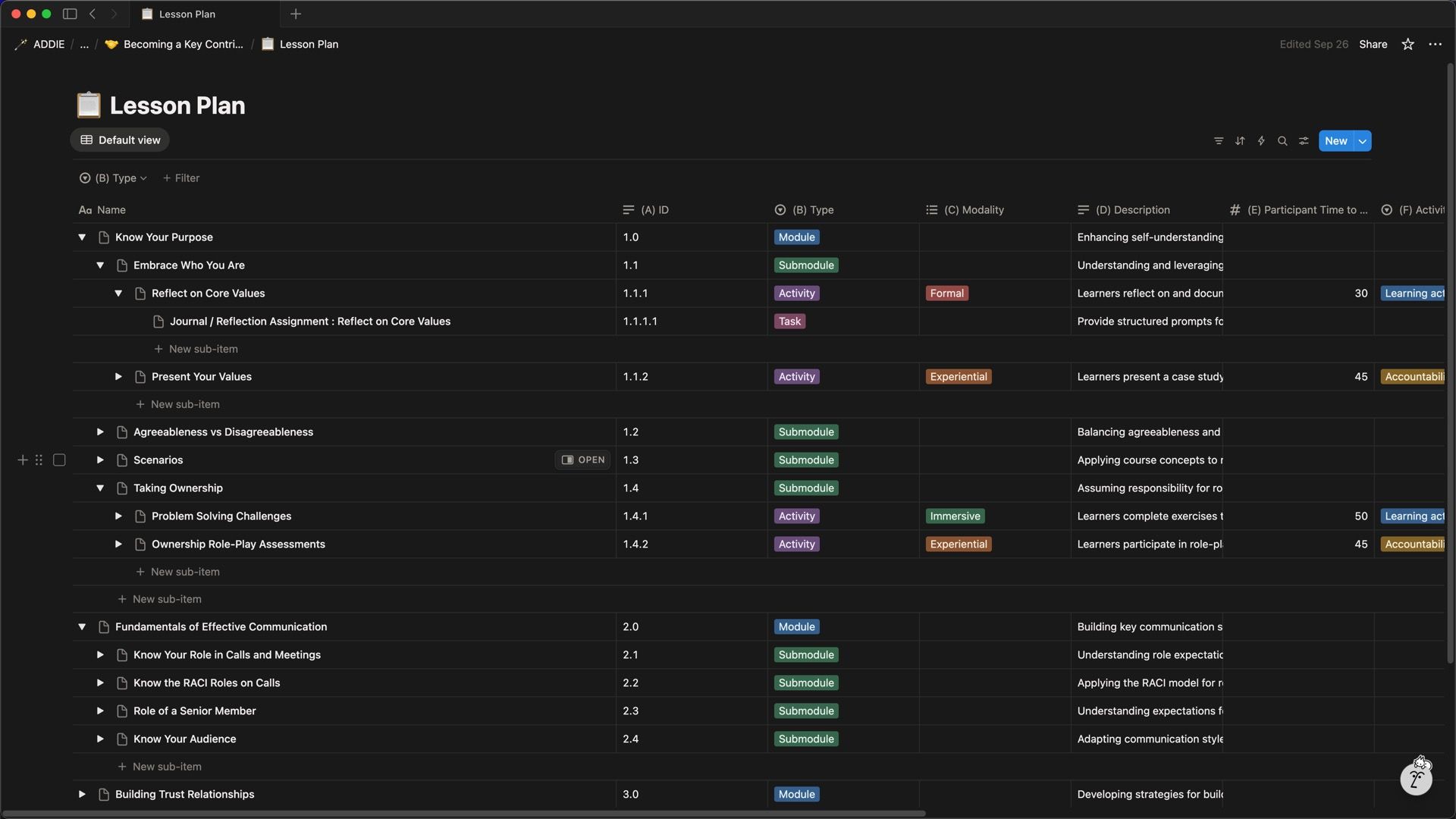 All outputs are generated and editable within Notion, where users can reorganize modules, adjust activity durations, refine descriptions, or delete and add new activities as necessary.